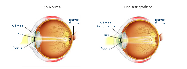 En este caso el ojo puede ser de tamaño mayor, menor o normal. El problema se localiza en la cornea, la membrana transparente en la parte frontal del ojo. En este caso la cornea no tiene la forma esférica normal, sino una forma ovalada como un balón de fútbol americano. Es por esta razón que la luz será enfocada por delante de la retina si pasa por el sitio mas curvo de la cornea y por detrás de la retina si pasa por el sitio mas plano, provocando visión borrosa para lejos y cerca.